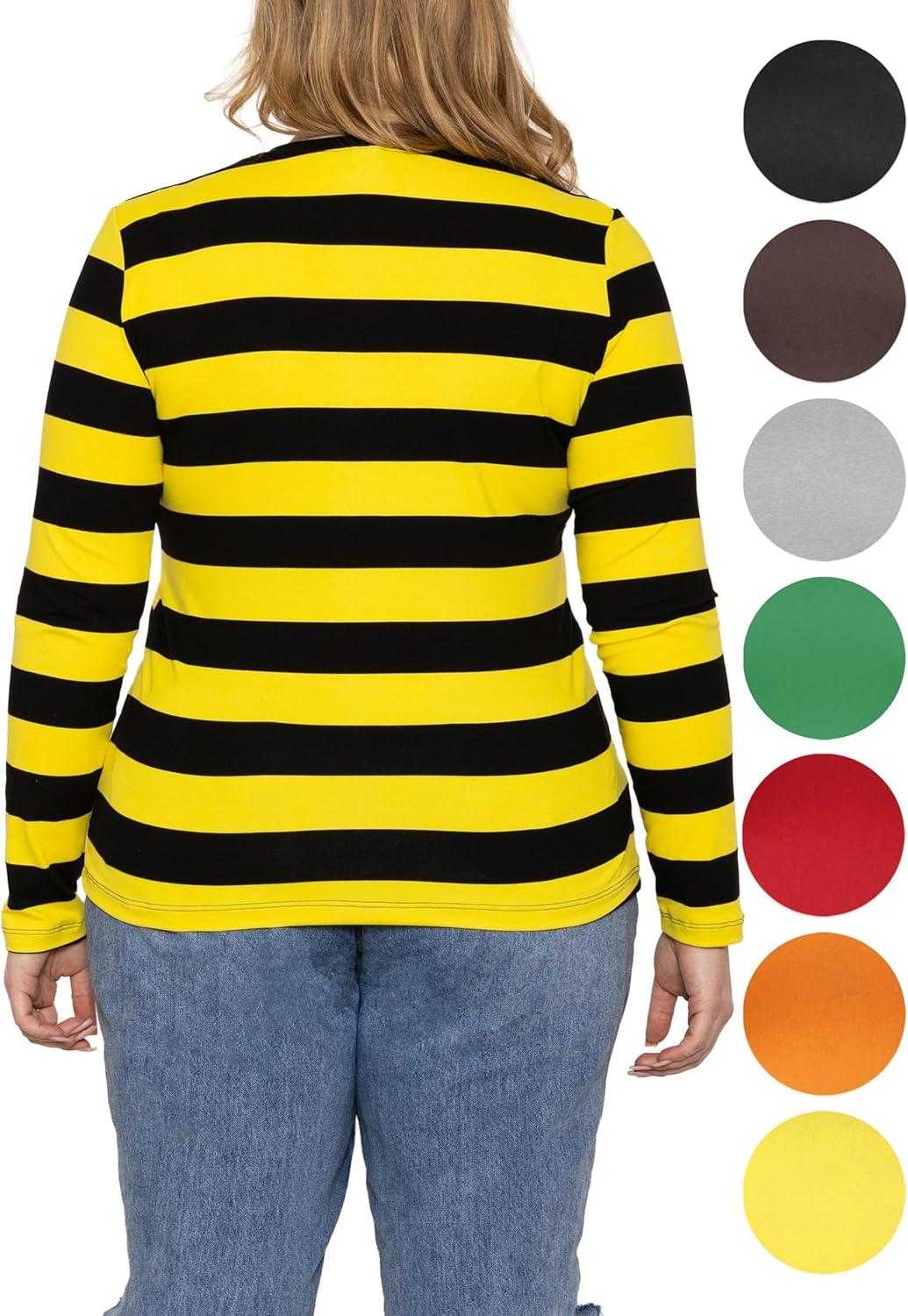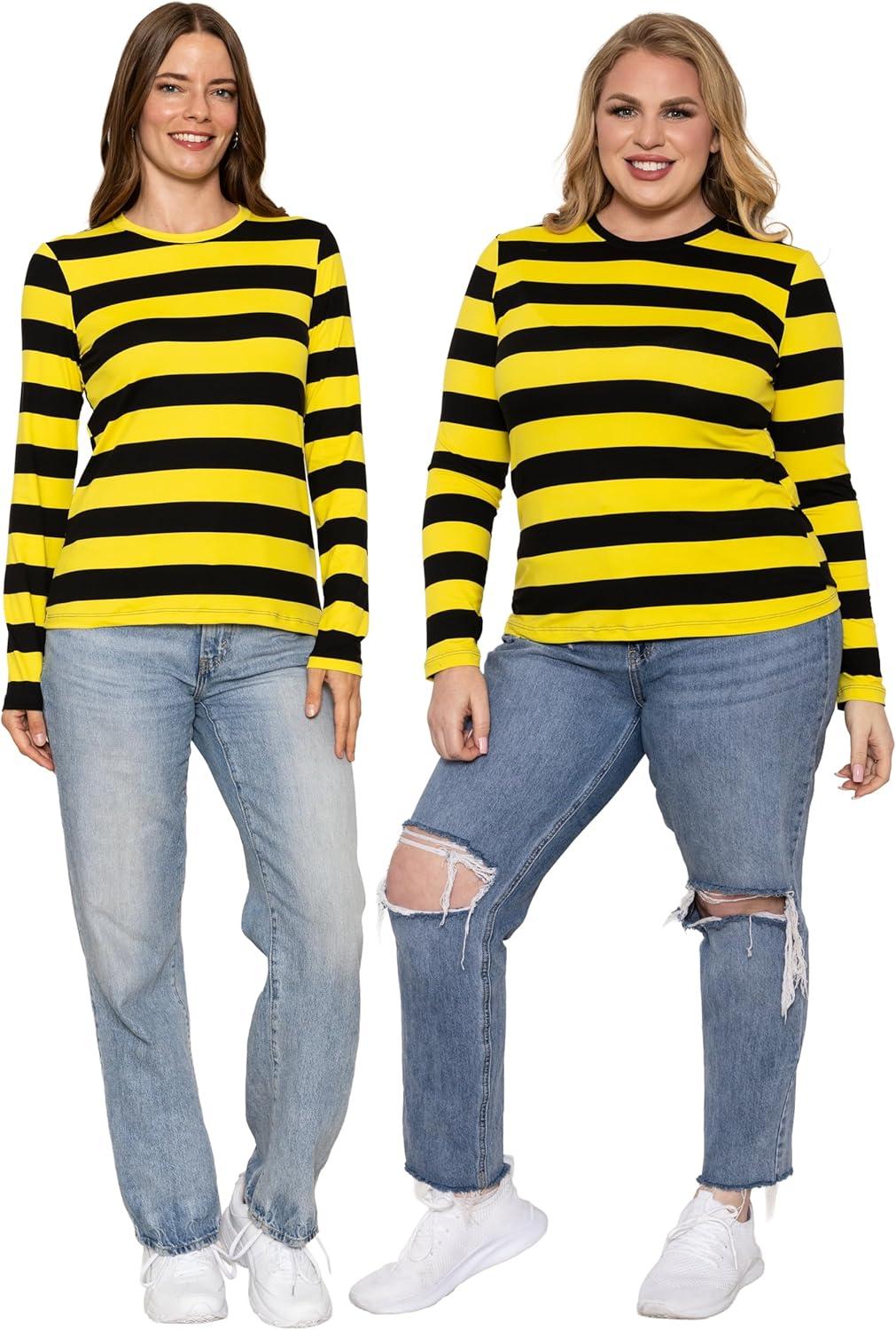 STRETCH IS COMFORT Women’s Long Sleeve Lay Flat Crew Neck Tee | Everyday Top | Plus & Regular Sizes S-5X(Black Yellow Stripes)