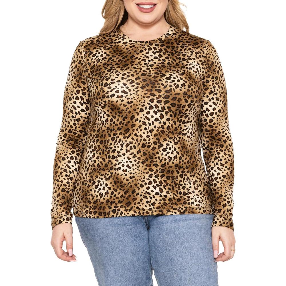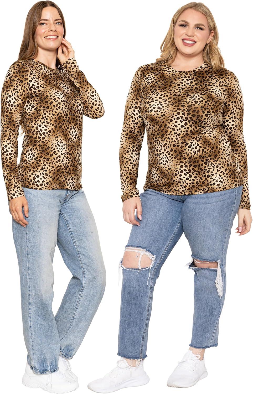 STRETCH IS COMFORT Women’s Long Sleeve Lay Flat Crew Neck Tee | Everyday Top | Plus & Regular Sizes S-5X(Brown Leopard)