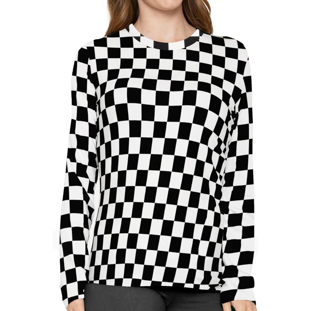 STRETCH IS COMFORT Women’s Long Sleeve Lay Flat Crew Neck Tee | Everyday Top | Plus & Regular Sizes S-5X(Checkered Black and White)