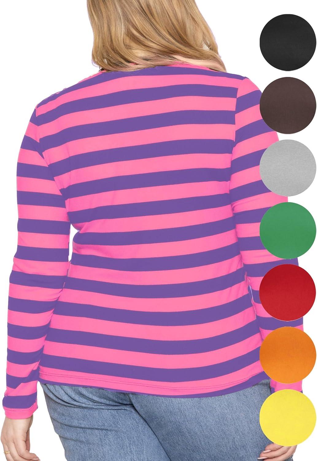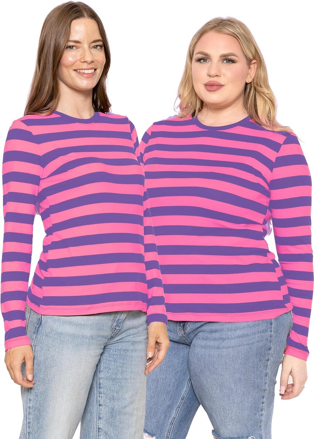 STRETCH IS COMFORT Women’s Long Sleeve Lay Flat Crew Neck Tee | Everyday Top | Plus & Regular Sizes S-5X(Pink Purple Stripes)